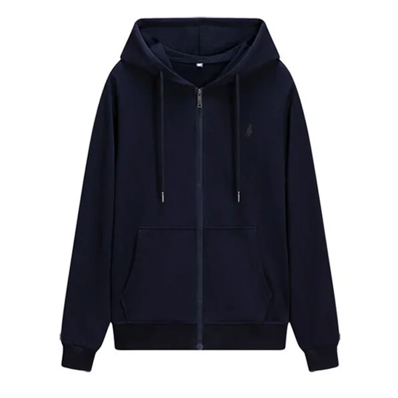 Stylish and warm men’s hoodie made of soft polyester knit, featuring a zipper closure, printed design, and comfortable fit for autumn and winter.
